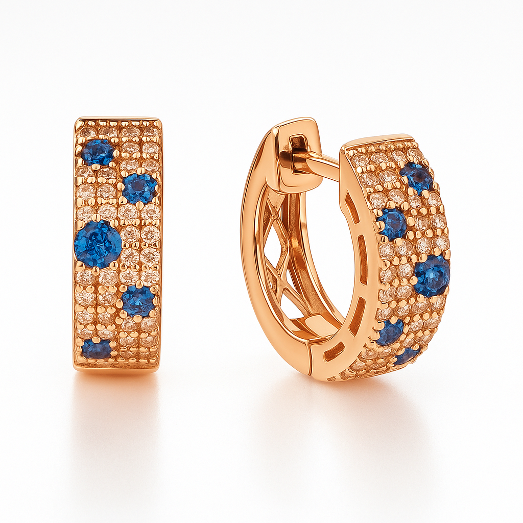 Bathed in the brilliance of gold, these timeless hoop earrings are alive with the celestial glow of deep blue sapphires, elegantly accented by pavé-set brilliant CZ. Each stone is meticulously placed to mimic a constellation in motion, creating an aura of sophistication that effortlessly transitions from day to evening glamour. A piece that whispers of quiet confidence and eternal grace.