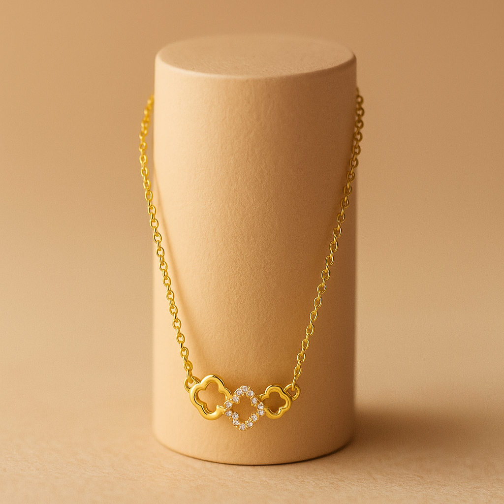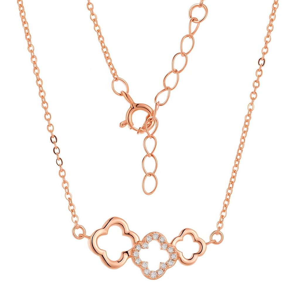 Suspended delicately along a fine chain, this 925 silvernecklace features three clover motifs, with the centrepiece encrusted in brilliant CZ. Available in white, rose, or yellow gold, it is a graceful adornment that sits elegantly along the collarbone, carrying with it the timeless charm of good fortune