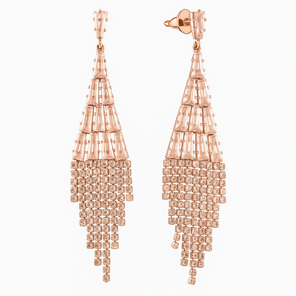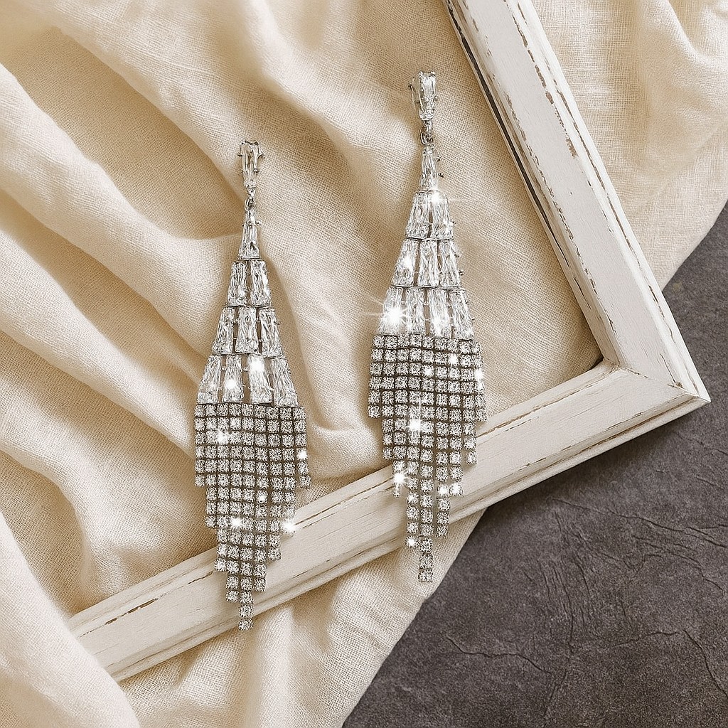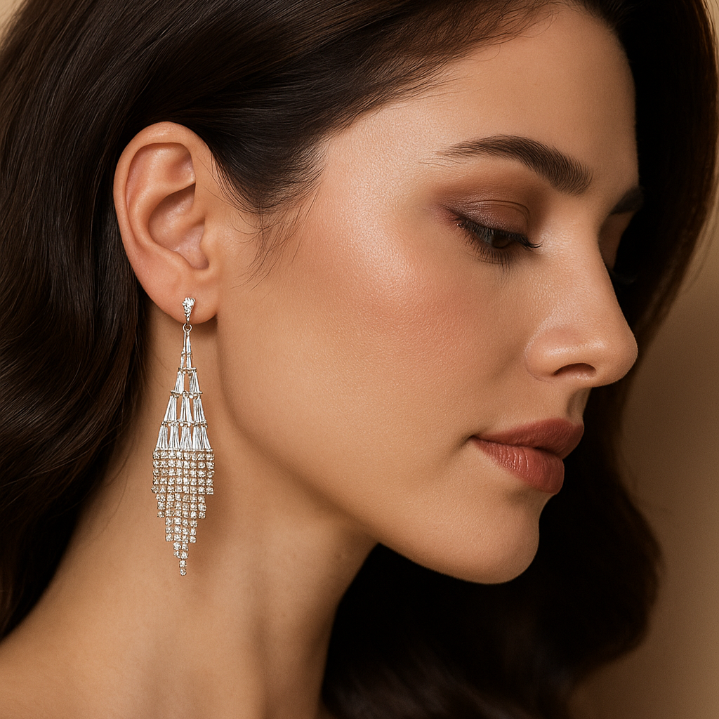 A symphony of light and movement, these chandelier earrings cascade in streams of dazzling brilliant CZ. Radiant and dramatic, they capture the glamour of a grand evening, each movement echoing the rhythm of elegance and allure.
