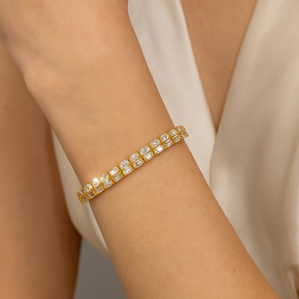 An eternal classic, the tennis bracelet is reimagined in breathtaking brilliance. A seamless row of VS1 diamonds, each hand-selected for fire and clarity, set in polished gold. Sophisticated and endlessly versatile, it is the ultimate symbol of grace and prestige.