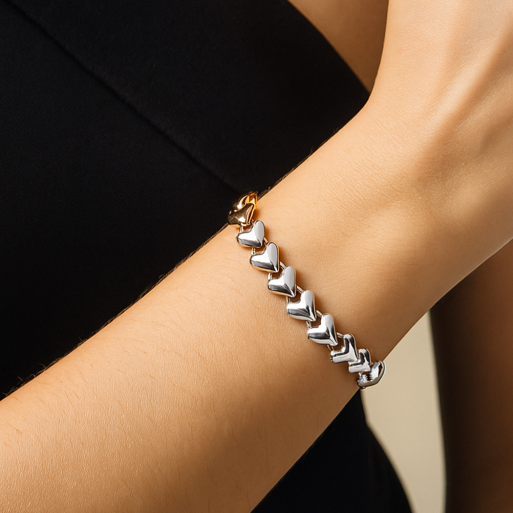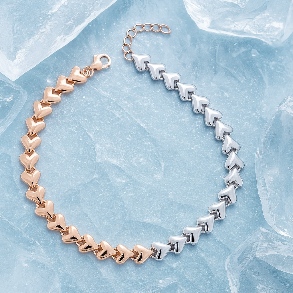 A symphony of romance, this bracelet features a cascade of sculpted heart links in contrasting white and rose gold. Fluid and bold, it represents the union of two souls in perfect balance. Worn alone or layered, it is a celebration of love eternal.