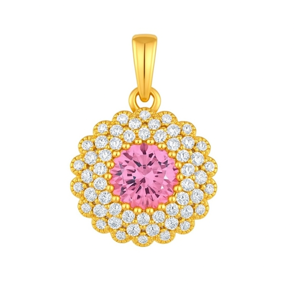 This exquisite pendant features a captivating round-cut pink sapphire at its center, radiating soft, romantic hues. Encircling the vibrant centerpiece is a double halo of meticulously set brilliant CZs, adding brilliance and depth to the design. The center stone can be customized to suit your style — choose from dazzling brilliant CZs, passionate rubies, deep blue sapphires, or lush green emeralds. Crafted in lustrous white gold, this timeless piece is perfect for adding a touch of luxury and elegance to any ensemble.