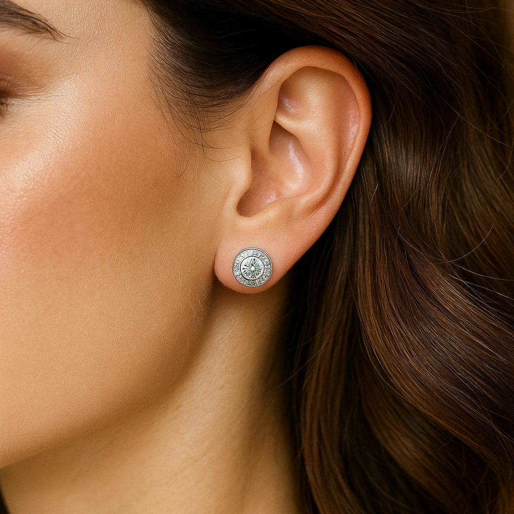 Understated yet endlessly radiant, these stud earrings feature a central brilliant CZ — customisable in cut and size — encircled by a halo of flawless brilliant CZ. Set in gold, available in white, yellow, or rose, they offer a modern classic that transitions effortlessly from daily wear to evening elegance.