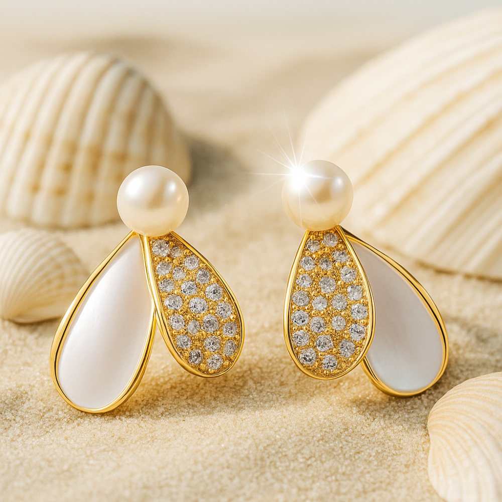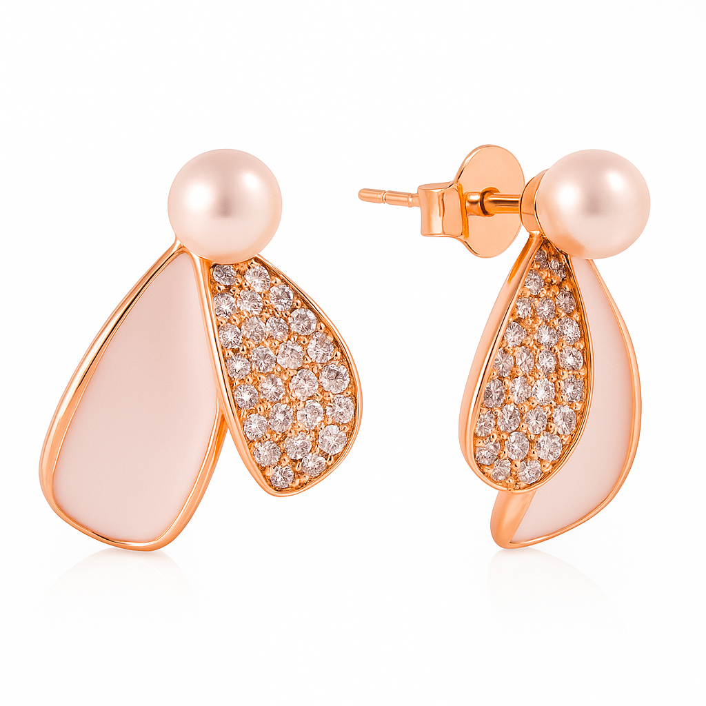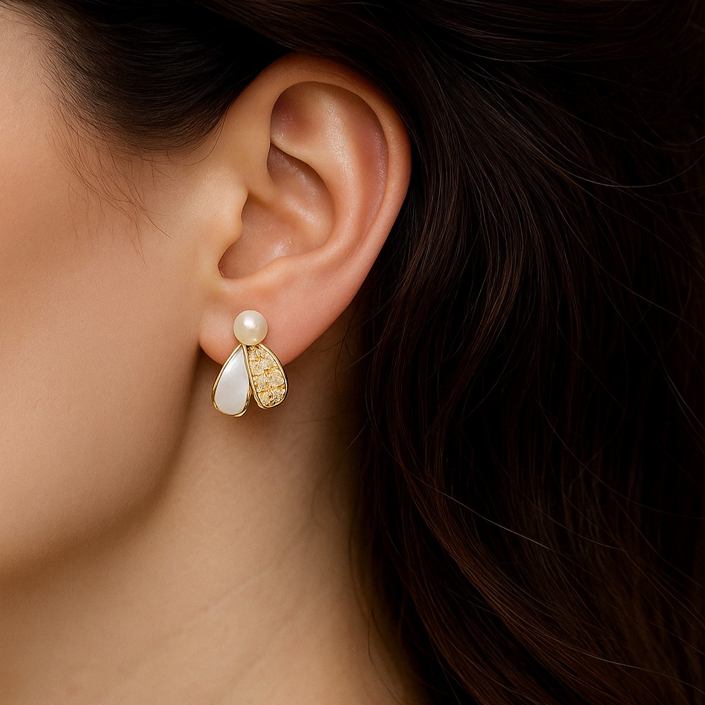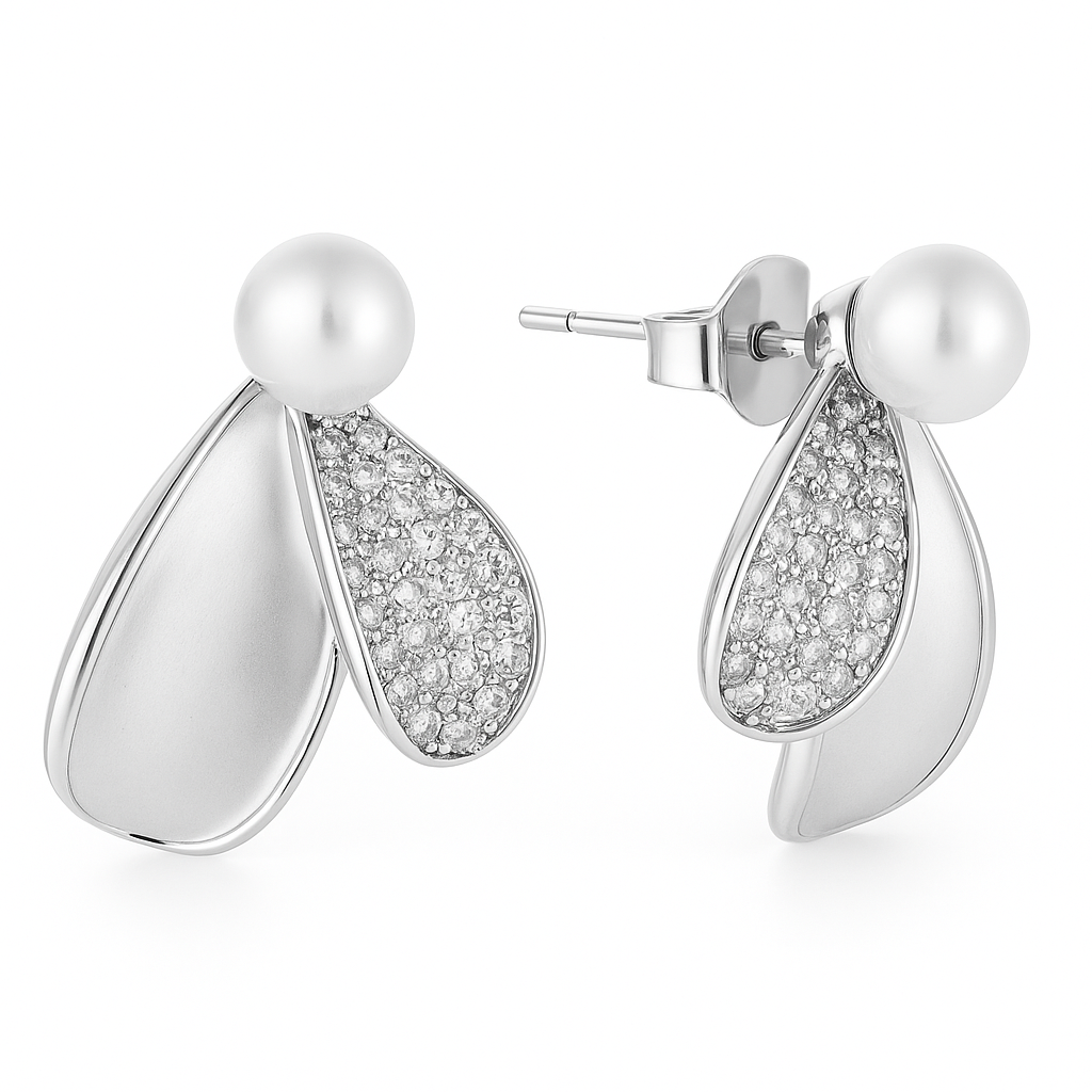 A contemporary expression of timeless beauty, these earrings feature sweeping petal-like forms in brilliant CZ pavé and mother-of-pearl, anchored by a glowing freshwater pearl. Bold yet graceful, they are crafted for the woman who radiates confidence and sophistication.
