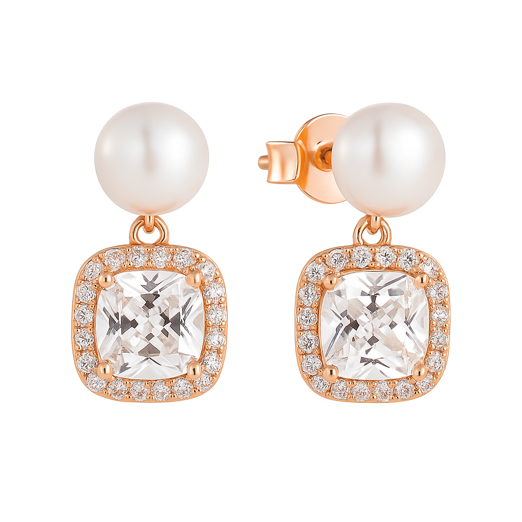 A glowing pearl rests above a cushion-cut brilliant CZ framed by a halo of brilliance, like a moon suspended over a glittering horizon. Romantic and enchanting, these earrings embody the poetry of moonlight—gentle, radiant, and enduring. A symbol of timeless love, they are the perfect jewel for a woman whose presence illuminates every room.