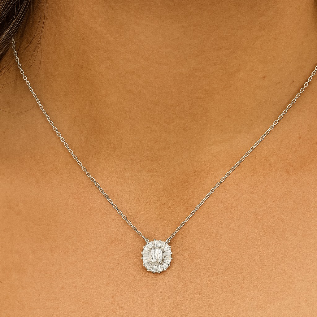 A striking expression of brilliance, this necklace features a sunburst-inspired pendant of baguette and round brilliant CZ arranged in a dazzling halo. Crafted in gold, available in white, yellow, or rose, it is designed to catch the light with every movement for an unforgettable sparkle.