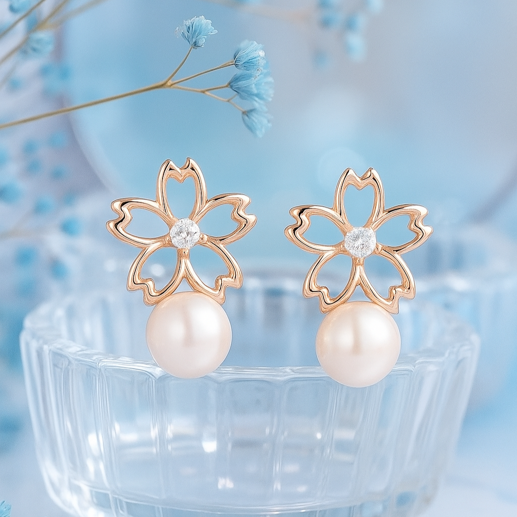 Sakura Blossom & Pearl brilliant CZ Stud Earrings