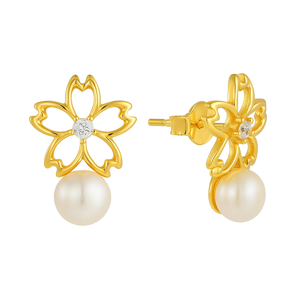 Exuding elegance in its purest form, these stud earrings present a sculpted sakura blossom in 925 silver— available in white, yellow, or rose silver— each with a glistening brilliant CZ at its core. Dangling below, a smooth freshwater pearl brings a touch of softness and movement, making them a versatile choice from daywear to evening occasions.