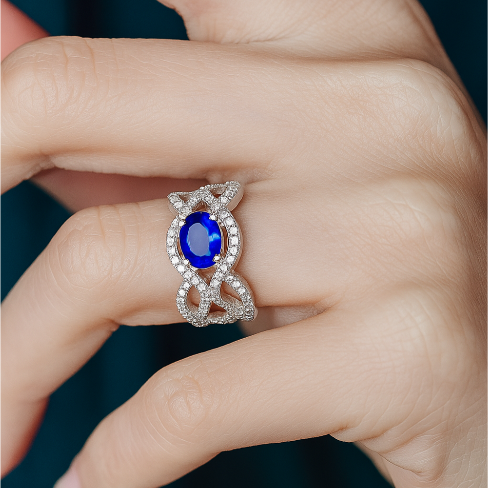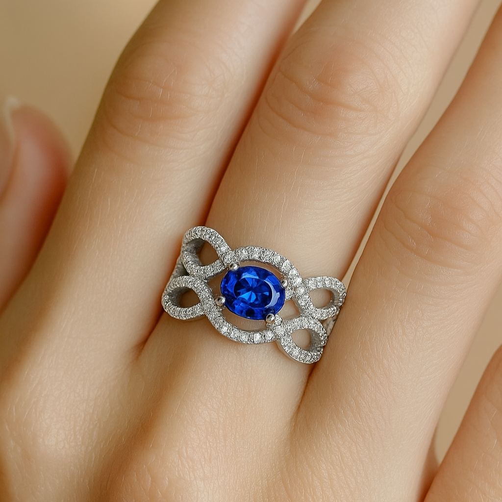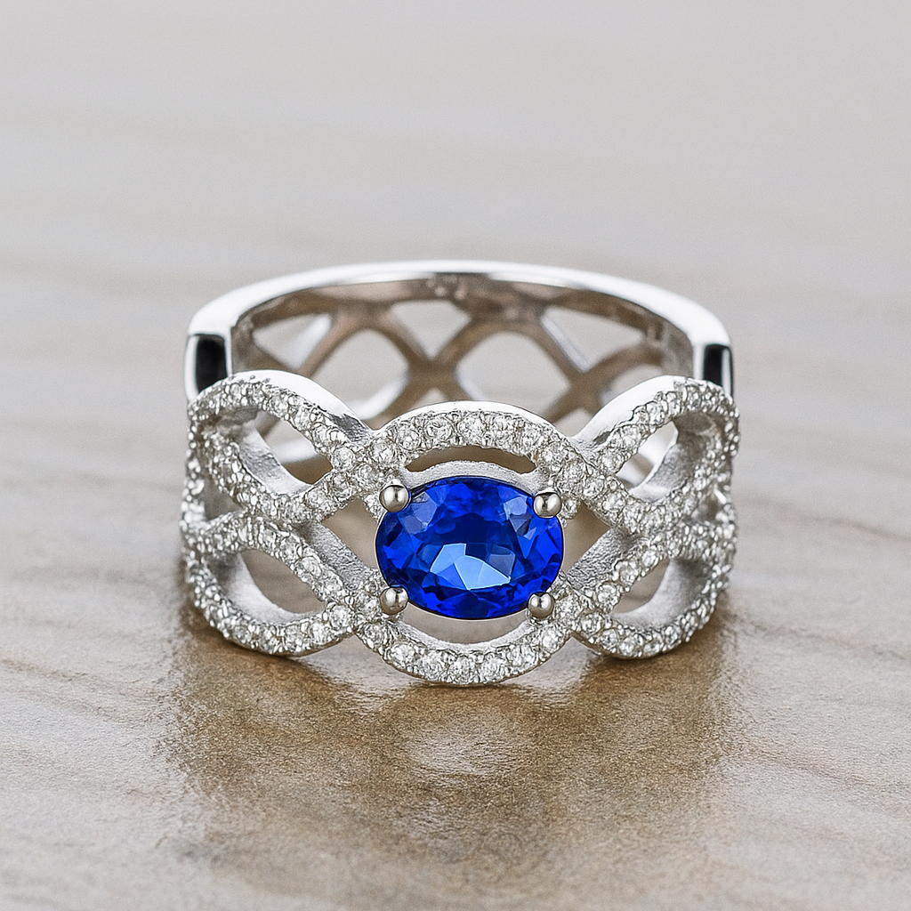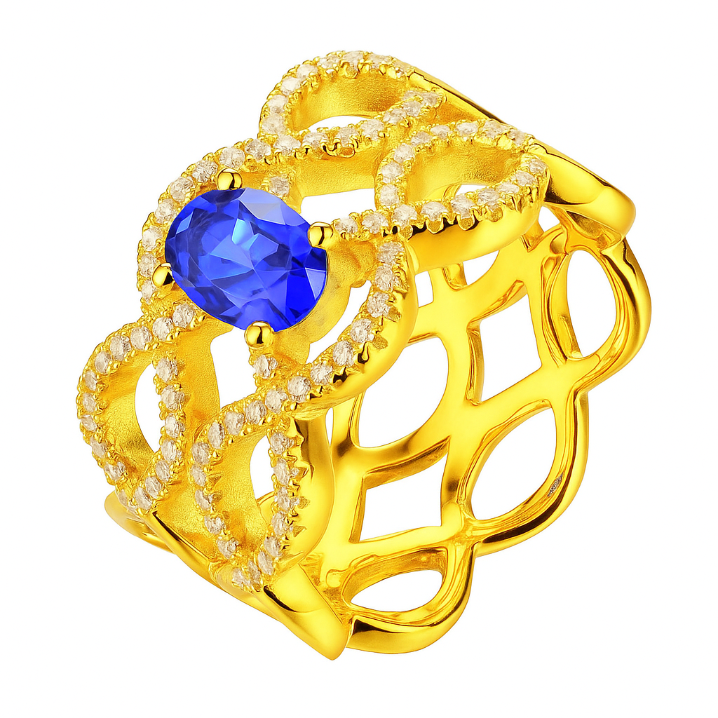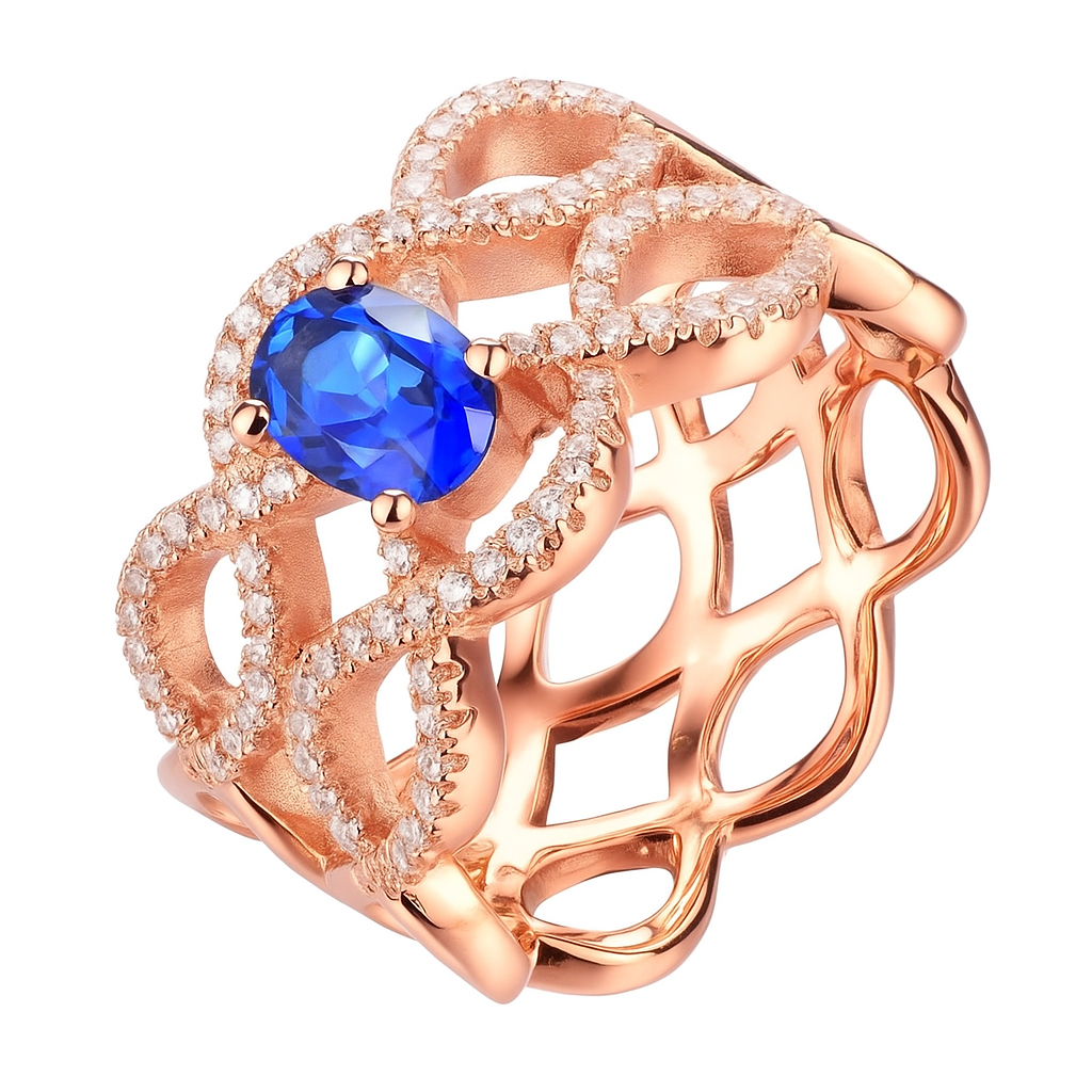 This bold 18K gold ring showcases an open lattice of interwoven loops, encrusted with VS1 diamonds and crowned with a vivid sapphire centre stone. A statement piece of strength and elegance.