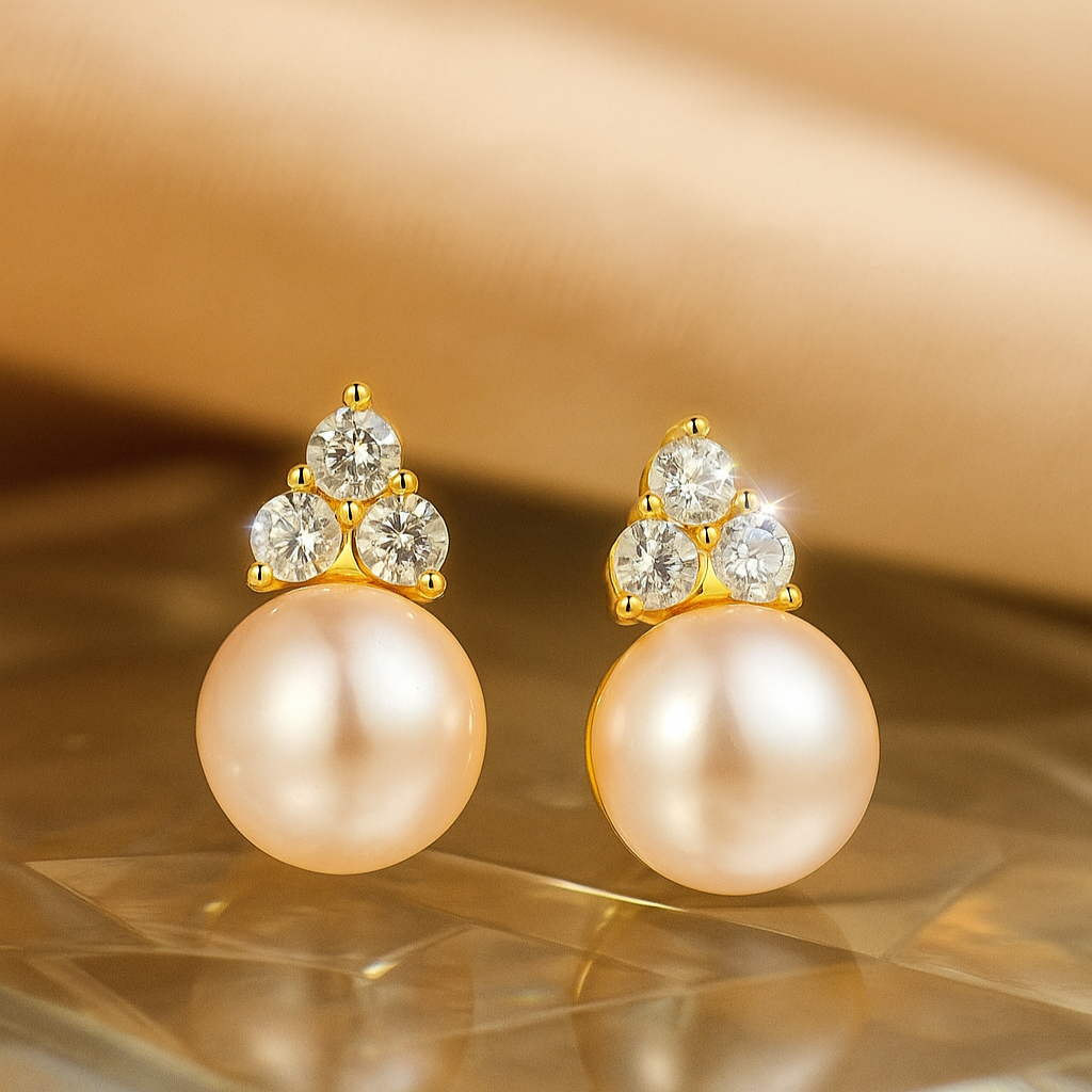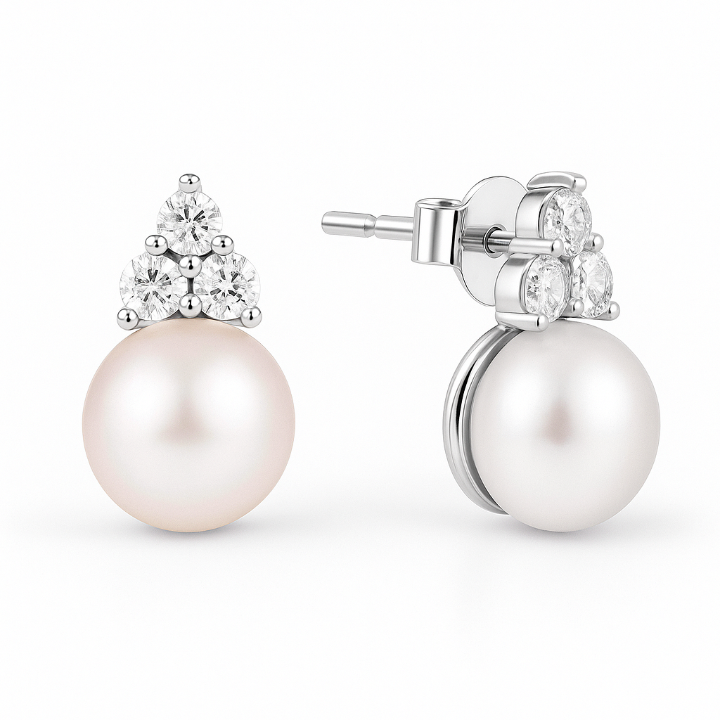 Understated yet captivating, these earrings feature a perfectly round freshwater pearl crowned with a cluster of three radiant brilliant CZ. Crafted in 925 silverand available in white, yellow, or rose finishes, they bring a touch of modern minimalism to a classic pearl design.